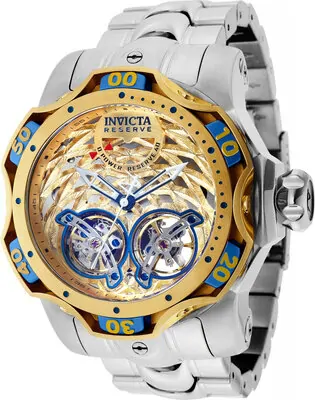 Tyto poutavé hodinky Invicta z kolekce Reserve jsou poháněny přesným automatickým strojkem s ocelovým, modrým, zlatým pouzdrem. Jeho tvář zdobí zlatý, modrý, kovový ciferník a chráněný pevným krystalem Flame Fusion Crystal. Tyto hodinky doplňuje ocelový pásek z nerezové oceli, který odolá vodě až 1000 m.Výjimečná chuť a výrazná paleta tohoto znalce objeví v kolekci Invicta Reserve nadčasové potěšení. Speciálně vyvinutý pro znalé, Reserve je přerodem toho nejlepšího, aby vytvořil dokonalou hodinářskou parádu. Tyto hodinky představují vrchol v nadřazenosti pro náročné milovníky.